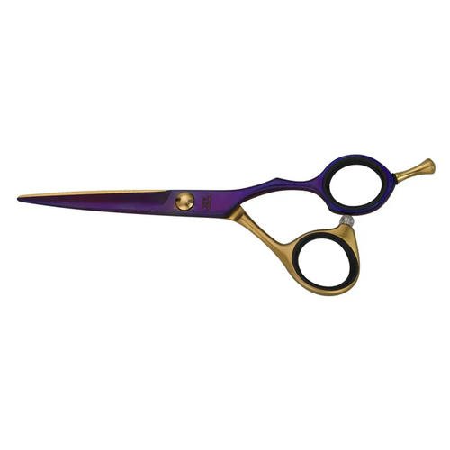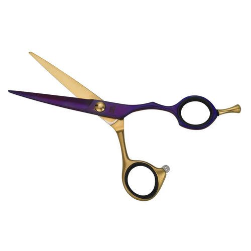 Стойкое к износу декоративное покрытие нитридом титана золотистого и фиолетового цвета придает ножницам игривый и необычный вид. Классический угол заточки позволяет выполнять более точно прямой срез. Отсутствие насечек на полотнах дает возможность работать в технике скользящего среза.