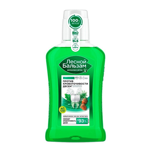 Профилактический ополаскиватель для полости рта лесной бальзам на отваре трав обладает иммуноактивным действием, помогает решить проблему кровоточивости десен и в 2 раза улучшает работу собственного иммунитета полости рта, снижая риск развития проблем с деснами*. Клинически-доказанный эффект: • с первого применения улучшает состояние десен* • до 94% снижает кровоточивость десен при регулярном использовании** • в 5 раз снижает скорость образования налета на зубах, уменьшая бактериальную нагрузку на мягкие ткани полости рта** • не нарушает баланс микрофлоры полости рта особенности состава: насыщенный хвойный вкус. Содержит хвойных комплекс (на основе экстрактов пихты, живицы, можжевельника) с отваром 5 целебных трав, экстрактом коры дуба и соком алоэ. Такой сбалансированный состав способствует укреплению кровеносных сосудов десен, улучшает кровообращение и питание в мягких тканях полости рта, препятствует повторному возникновению кровоточивости при чистке зубов. Рекомендации: • ополаскиватель одобрен стоматологической ассоциацией россии и рекомендован в качестве профилактического средства при воспалении и кровоточивости десен (гингивите, пародонтите). • использовать после каждой чистки зубов, а также после еды для очищения межзубных промежутков. Наполните колпачок ополаскивателем и тщательно прополощите полость рта в течение 30 секунд. • не требуется полоскать после использования водой. • при кровоточивости десен рекомендуется использовать совместно с зубной пастой лесной бальзам после каждой чистки зубов, а также тщательно полоскать полость рта после каждого приема пищи. В период ремиссии сохранить использование минимум 1 раз в день для предупреждения развития проблем десен и улучшения питания мягких тканей полости рта. • подходит для использования в ирригаторе. • подходит для использования в период беременности и лактации *лесной бальзам поддерживает иммунитет и усиливает эффективность работы естественных защитных функций полости рта. Свойства подтверждены клиническими испытаниями рф, 2016 – 2017. **при совместном использовании зубной пасты и ополаскивателя лесной бальзам на основе хвойного комплекса с отваром трав согласно клиническим испытаниям, через 1 месяц использования.