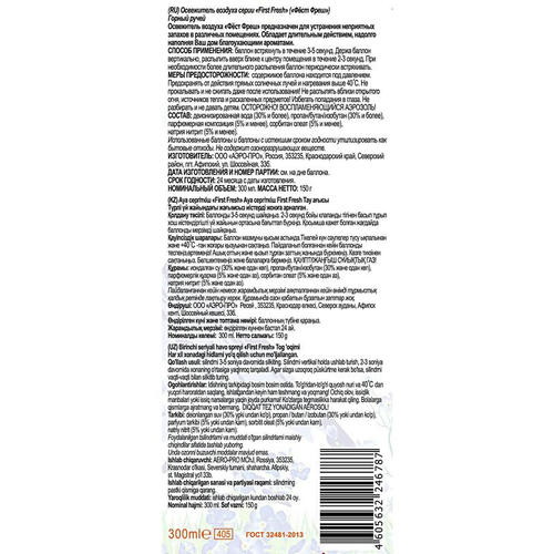 Способ применения: баллон встряхнуть в течение 3–5 секунд. Держа баллон вертикально распылить вверх ближе к центру помещения в течение 2–3 секунд. При необходимости более длительного распыления баллон периодически встряхивать.