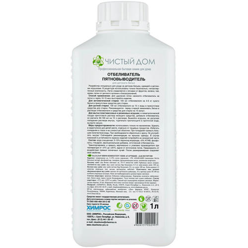 Способ применения: Для удаления пятен нанесите отбеливатель на пятно и через 10-15 минут выстирайте изделие. Для автоматической стирки добавьте 100мл отбеливателя на 4-5кг сухого белья присутствии средства для стирки. Для ручной стирки добавьте 100мл отбеливателя на 10л воды в присутствии средства для стирки, предварительно замочив белье на 15 минут. Для мытья пластмассовых и резиновых игрушек в неметаллической посуде приготовьте раствор моющего средства и добавьте отбеливатель 50-100мл на 10л раствора, вымойте игрушки и тщательно прополощите в проточной воде