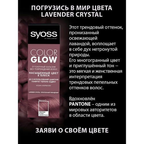 Этот трендовый оттенок, пронизанный освежающей лавандой, воплощает в себе дух нетронутой природы. Его многогранный цвет и приглушённый тон — это мягкая и женственная интерпретация трендовых пепельных оттенков волос. Попробуйте насыщенный цвет стойкостью до 8 использований шампуня и тонированиванием первой седины.Оттеночный бальзам SYOSS ColorGLOW идеально подходит, чтобы:1. Попробовать новый временный оттенок.2. Освежить Ваш текущий цвет волос.3. Затонировать первую седину.