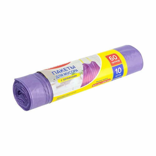 Пакеты для мусора, BonHome, с затяжками, всегда пригодятся в хозяйстве. Затяжки предотвращают просыпание мусора из наполненного пакета и образуют удобные ручки для его перемещения. Способ применения: вложить пакет в ведро, после заполнения завязать и выбросить в мусорный контейнер. В рулоне 10 пакетов. Объём пакета: 60 л. Состав: полиэтилен высокого давления (низкой плотности), технологические добавки, краситель на основе полиэтилена