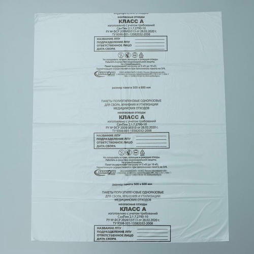 Пакеты для сбора, хранения и утилизации медицинских отходов, класс «А», 50×60 см, 14 микрон, 50 шт, цвет белый