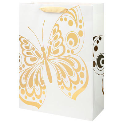 Белые подарочные пакеты с золотым фольгированным тиснением в виде бабочки. В блоке 4 дизайна. Плотность 210 г/м2. Размер пакета 30х40х12см.