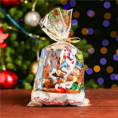 Подарочный пакет для конфет. Дизайн: голова оленя выглядывает из-за нижнего края пакета, над головой – белые небольшие снежинки и еловые ветки, рисунок на прозрачной части пакета. Надпись: С Новым годом! Подложка серебро. Размер пакета: 20 х 35 см