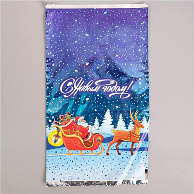 Подарочный пакет для конфет. Дизайн: Дед Мороз едет в санях по зимнему лесу, фон тёмно-синий. Надпись: С Новым годом! Задняя часть серебряная. Размер пакета: 20 х 35 см