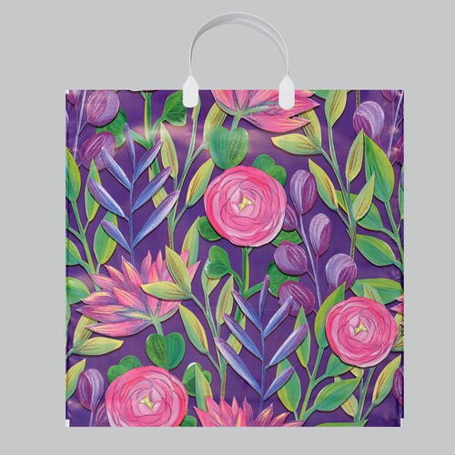 Красочный пакет с рисунком для фасовки, упаковки товаров с петлевой ручкой из пластика.