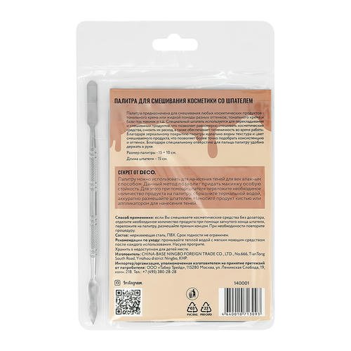 Длина шпателя – 15 см. Секрет от DE.CO:Палитру можно использовать для нанесения теней для век влажным способом. Данный метод позволит придать макияжу особую стойкость. Для этого при помощи шпателя переложите необходимое количество продукта на палитру, сбрызните термальной водой, аккуратно размешайте шпателем. Наносите продукт кистью или аппликатором для нанесения теней.