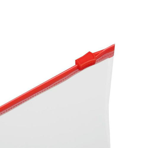 Изготовлена из прочного прозрачного пластика толщиной 150 мкм с гладкой фактурой. Формат А4 (333х230 мм). Герметичная застежка-зиплок защищает документы от механических повреждений, а также пыли и влаги. Цвет молнии – красный