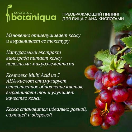 Натуральный экстракт винограда питает кожу полезными микроэлементами. Комплекс Multi Acid из 5 AHA-кислот стимулирует естественное обновление клеток, выравнивает тон и улучшает качество кожи. Кожа становится идеально ровной, сияющей и здоровой.