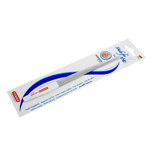Пилка 20 см вогнутая с микросапфирным напылением и пластиковой ручкой, снабжённой сдвигателем кожи. Для удобства использования пилочка имеет две рабочие поверхности с крупным и мелким напылением.