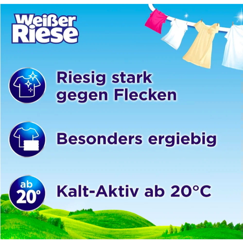 Высокоэффективное моющее средство Wei_er Riese Universal Megaperls – идеальное моющее средство для семей с детьми. Благодаря своей огромной очистительной способности, он чрезвычайно прочен против пятен и особенно экономичен, обеспечивает гигиенически чистое и сияющее чистое белье. Мощный Megaperls можно использовать при температуре от 20 °C до 95 °C и обеспечивает сияющее чистое белое и светлое белье. Хороших результатов стирки можно добиться даже за 20 градусов.