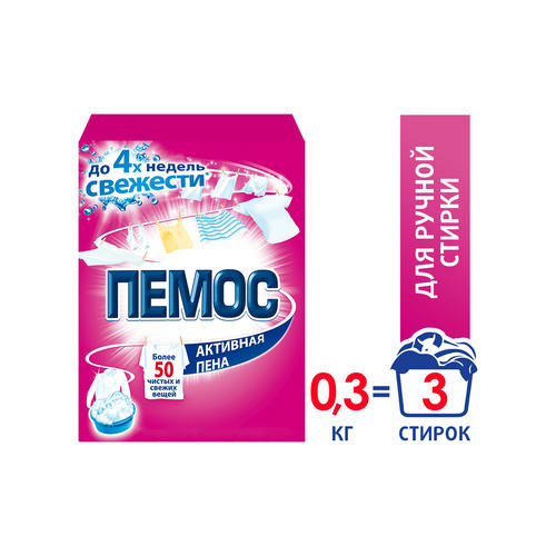 Пемос “Активная пена” – стиральный порошок с эффективной формулой, которая отлично отстирывает различные загрязнения. Проникая между волокнами ткани, он растворяет и удаляет грязь, а содержащийся в его формуле активный кислород придает вашим вещам сияющую белизну. Порошок предназначен для стирки в стиральных машинах активаторного типа и ручной стирки. Для достижения наилучшего результата стирки рекомендуется предварительное замачивание.