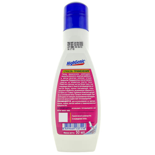 Способ применения: Предварительно протестировать средство на незаметном участке ткани. Поместить плотную, чистую, белую ткань под очищаемую область. Нанести пятновыводитель на чистую, белую, хорошо впитывающую ткань, аккуратно обработать загрязненную поверхность. Оставить на 25-30 минут. Тщательно почистить щеткой до исчезновения пятна. Промыть теплой водой. При необходимости повторить вышеуказанные процедуры, увеличив время воздействия пятновыводителя