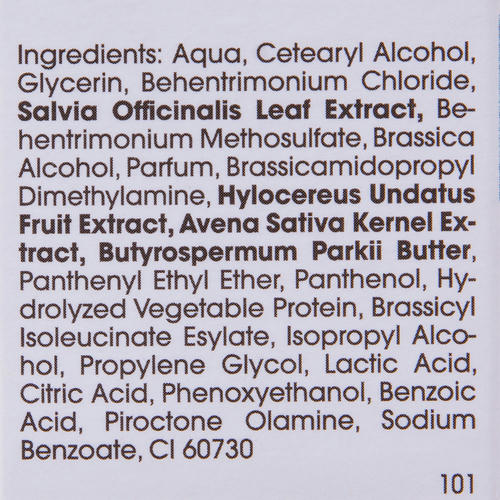 Состав: aqua, cetearyl alcohol, glycerin, behentrimonium chloride, salvia officinalis leaf extract, behentrimonium methosulfate, brassica alcohol, parfum, brassicamidopropyl dimethylamine, hylocereus undatus fruit extract, avena sativa kernel extract, butyrospermum parkii butter, panthenyl ethyl ether, panthenol, hydrolyzed vegetable protein, brassicyl isoleucinate esylate, isopropyl alcohol, propylene glycol, lactic acid, citric acid, phenoxyethanol, benzoic acid, piroctone olamine, sodium benzoate, ci 60730