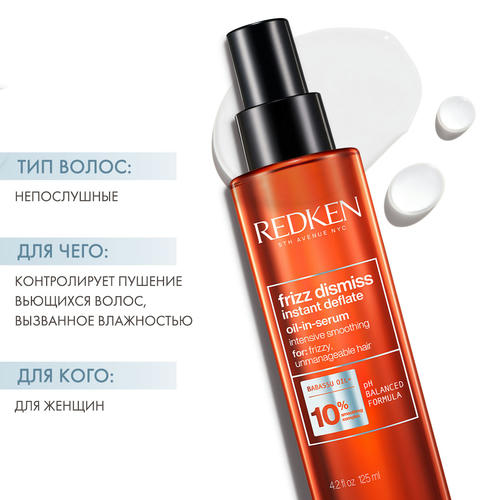Несмываемое масло-сыворотка Frizz Dismiss Instant Diflate создано специально для дисциплины всех типов непослушных волос, подвергающихся механическому, химическому и термическому воздействию, например, окрашиванию и кератиновому выпрямлению. Средство защищает от неблагоприятных погодных условий и дисциплинирует непослушные и вьющиеся волосы. Обеспечивает лёгкое и комфортное расчёсывание.