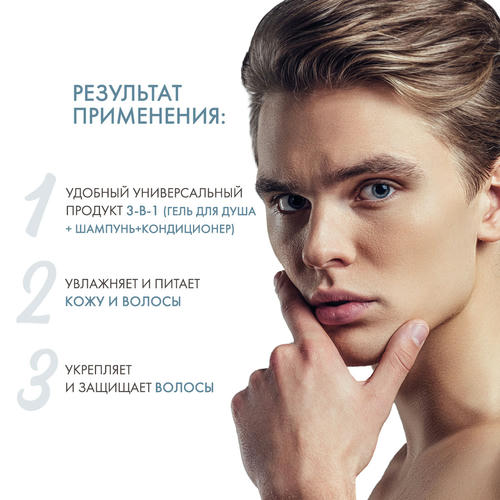 Равномерно нанесите на влажные волосы и тело. Вспеньте. Тщательно смойте.