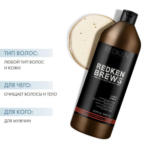 Питательный уход 3 в 1 от Redken Brews: гель для душа + шампунь + кондиционер для волос – идеальное решение для тех, кто любит оптимизировать место на полках в душе. Формула ухода интенсивно питает, увлажняет, укрепляет, защищает кожу и волосы. Средство для очищения и смягчения волос и кожи в одном флаконе – мечта любого мужчины, так как занимает мало места и приносит максимум эффективности.