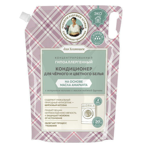 Способ применения: Концентрированный гипоаллергенный кондиционер для чёрного и цветного белья на основе масла амаранта сварен с душой и заботой по рецептам Агафьи Тихоновны Ермаковой. Он содержит активные натуральные компоненты, которые проникают глубоко в структуру тканей, защищая их от выцветания и преждевременного износа. Облегчает процесс глажения и уменьшает возникновение статического электричества. Придаёт необыкновенную мягкость и сохраняет насыщенность тёмных оттенков изделий. Берёзовая кора в народной медицине используется на протяжении многих веков. С помощью современных технологий мы получили экстракт с высоким уровнем содержащегося в берёзе бетулина – уникального природного антисептика, обладающего доказанным противовирусным и антибактериальным действием. Серебряная вода содержит ионы серебра, которые обеспечивают бактерицидный эффект. Именно на ней изготовлена вся серия бытовой химии от бабушки Агафьи! Масло амаранта укрепляет и обновляет волокна ткани, делает бельё невероятно нежным и мягким. Препятствует появлению катышков и преждевременному износу одежды. Экстракт василька придаёт белью приятный аромат, способствует восстановлению яркости чёрных и цветных тканей. Масло таёжной брусники делает бельё мягким и воздушным, облегчает процесс утюжения. -Сохраняет яркость цвета -Разглаживает волокна ткани -Обладает антистатическим действием -Подходит для ручной и машинной стирки -Дарит приятный аромат