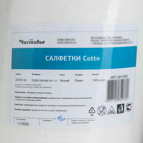 Салфетки изготовлены из нового материала cotto на основе хлопка. Ткань обладает сетчатой структурой, обеспечивает максимально быстрое поглощение влаги.