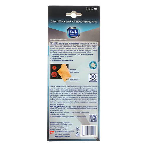 Салфетка Top House используется для очистки стеклокерамики от пыли, пятен, жира, копоти, а также для полировки и придания блеска без царапин. Она имеет две стороны: