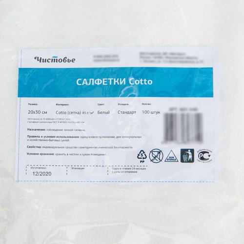 Салфетки изготовлены из нового материала cotto на основе хлопка. Ткань обладает сетчатой структурой, обеспечивает максимально быстрое поглощение влаги.