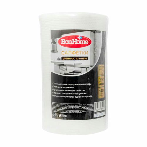 Салфетки “Универсальные”, BonHome, подходят для уборки любых поверхностей. Повышенная впитываемость и прочность. В рулоне 140 салфеток. Состав: вискоза – 70%, полиэфирное волокно – 30%