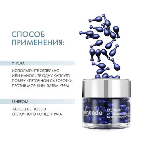 Утром: используйте отдельно или наносите одну капсулу поверх клеточной сыворотки против морщин, затем крем.
