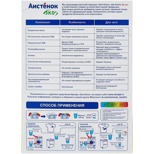 Предназначено для стирки, отбеливания и замачивания детской одежды, в том числе пеленок и белья детей первого года жизни. Для всех видов тканей, кроме шерсти и шелка, в стиральных машинах любого типа и ручной стирки.