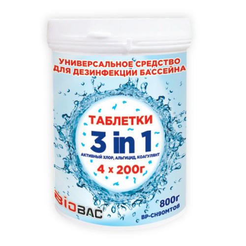 Средство для бассейна Таблетки Универсал 3 в1 (хлор, альгицид, коагулянт) 800 г BIOBAK BP-MT800 предназначена для обработки 15 м3 воды. Вес одной таблетки: 200 г.