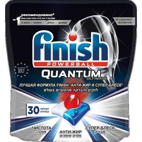 Finish Quantum Ultimate – это трехкамерные капсулы нового поколения с двумя гелевыми компонентами для посудомоечной машины. Каждая капсула состоит из трех частей: белый порошок – удаляет сложные загрязнения, синий гель: нейтрализует жир, красный гель: придает ослепительный блеск. Формула Finish Quantum Ultimate – лучшая формула в линейке Finish, что позволяет каждый раз получать ослепительный результат