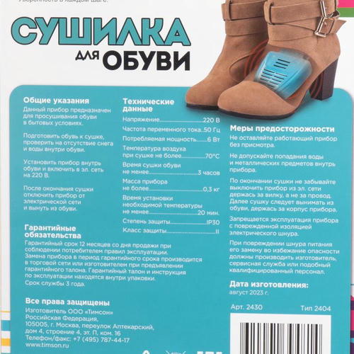 Сушилка для обуви, Mr.Sushkin – незаменимый помощник во время дождей и снега. Прибор предназначен для просушивания обуви в бытовых условиях. Перед использованием внимательно ознакомьтесь с инструкцией по применению и мерами предосторожности на упаковке