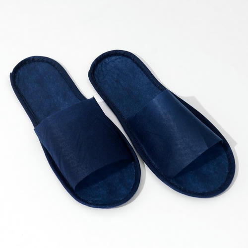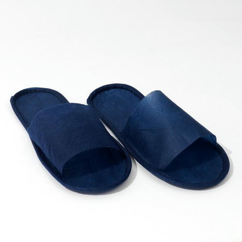 Одноразовые тапочки темно-синие с открытым мысом на нескользящей подошве имеют ровные швы и прошиты плотной ниткой. Союзка (верхний мыс) так же прошит с двух сторон, что значительно повышает прочность тапочка и обеспечивает длительное ношение без повреждений. Одноразовую обувь очень удобно взять с собой в дорогу или предложить гостям.