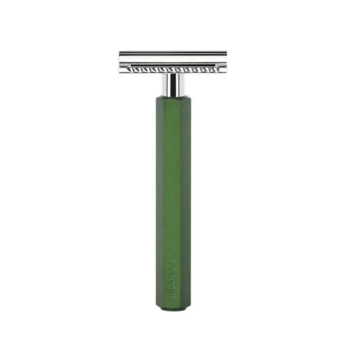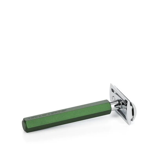 Т-образная бритва, спроектированная берлинским дизайнером Марком Брауном, с ручкой из анодированного алюминия и покрытием зеленого цвета.