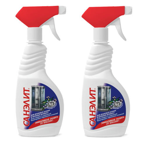 САНЭЛИТ-Антиплесень 500мл (с триггером). Предназначено для чистки душевых кабин, ванн, перегородок из стекла и пластика, керамической плитки, хромированных поверхностей от жировых, известковых, мыльных загрязнений и налета ржавчины, а также для предотвращения образования плесени.