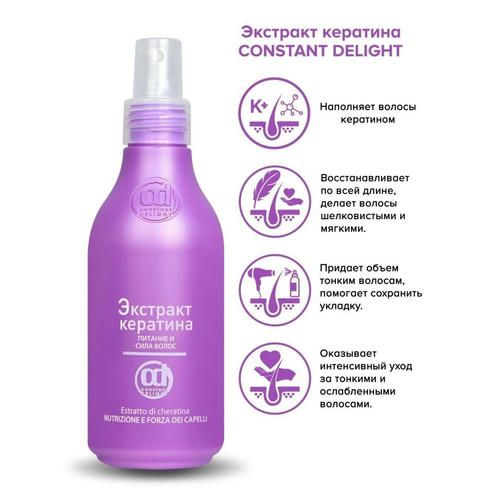 Обеспечить тонким и ослабленным волосам интенсивный уход, питание и защиту в течение дня помогает специальный спрей Constant Delight Intensive Spray Con Estratto Di Cheratina. Он обладает легкой текстурой, равномерно распределяется, не перегружает даже при обильном нанесении, хорошо кондиционирует и укрощает непокорные пряди.