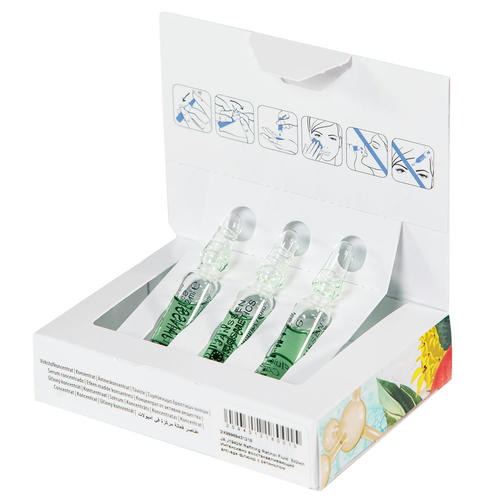 Оберните кончик ампулы бумажной салфеткой, отломите резким движением и нанесите содержимое на лицо, шею и декольте. Дождитесь полного впитывания, а затем нанесите Light Mattifying Cream или Regulating Retinol Cream.