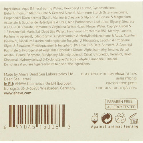 Aqua (Mineral Spring Water), Hexyldecyl Laurate, Cyclomethicone, Behentrimonium Methosulfate & Cetearyl Alcohol, Aluminum Starch Octenylsuccinate,Propanediol (Corn derived Glycol), Alanine & Creatine & Glycerin & Glycine & Magnesium Aspartate & Saccharide Hydrolysate & Urea, Aloe Barbadensis Leaf Juice, Glyceryl Stearate & PEG-100 Stearate, Hamamelis Virginiana (Witch Hazel) Flower Water, Caprylyl Glycol & 1,2 Hexanediol, Maris Sal (Dead Sea Water), Panthenol (Pro Vitamin B5) , Menthyl Lactate, Parfum (Fragrance), Iodopropynyl Butylcarbamate & Methylisothiazolinone & Aqua, Allantoin, Bisabolol, Disodium auriminodipropionate Tocopheryl Phospates, Lecithin & Propylene Glycol & Squalene (Phytosqualene) & Tocopherol (Vitamin E) & Beta-Sitosterol & Ascorbyl Palmitate & Hydrogenated Vegetable Glycerides Citrate, Alpha Isomethyl Ionone, Benzyl Alcohol, Benzyl Benzoate, Butylphenyl Methylpropional, Citral, Citronellol, Geraniol, Hexyl Cinnamal, Hydroxyisohexyl 3-Cyclohexene Carboxaldehyde, Limonene, Linalool