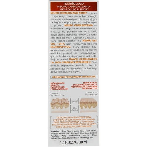 Всего несколько капель вещества достаточно, чтобы восполнить потерю влаги клетками кожи. Основой формулы средства является гликолевая кислота, обеспечивающая мягкую эксфолиацию ороговевших клеток, а также существенное осветление пигментации. 100 % стабильный витамин С служит превосходным антиоксидантом, напрочь уничтожающим тусклость лица, а уникальный нейропептид, запатентованная разработка бренда, блокирует сокращение лицевых мышц, провоцирующих образование мимических морщин. Сыворотка Bielenda Neuro Glicol + Vit.C в несколько раз усиливает усвояемость ингредиентов вашего основного крема.