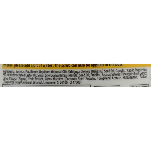 Активный комплекс скраба обогащен витаминными экстрактами ананаса и папайи, которые обладают противоотечными и антицеллюлитными свойствами, оказывают смягчающее и увлажняющее действия, стимулируют процесс регенерации клеток, ускоряют выработку эластиновых и коллагеновых волокон, повышают упругость и защитные функции кожного покрова.