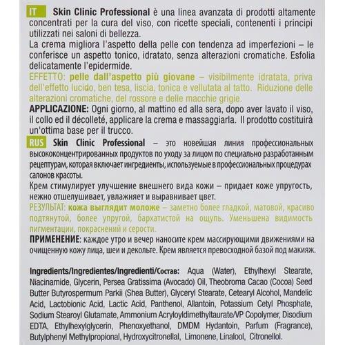 Это средство значительно повышает качество жирной и проблемной кожи. Содержащиеся в нем активные компоненты регулируют выделение кожного жира, соответственно, при его использовании поверхность кожи не будет так сильно блестеть и лосниться. Крем сужает расширенные поры, сокращает зоны покраснения и борется с угревой сыпью и уже произошедшими угревыми изменениями. При этом он нежно и деликатно отшелушивает отмершие клетки эпидермиса, что помогает коже сиять. Замечено, что при регулярном использовании крема Skin Clinic Professional существенно сокращается глубина морщин, рельеф лица становится значительно более гладким, а кожа упругой.