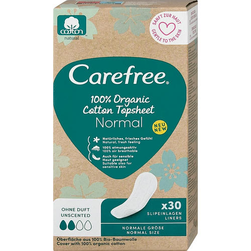 Carefree Organic Cotton гигиенические прокладки обеспечивают ощущение комфорта и безопасности в течение дня. Свойства: идеальный размер для дней с легкой растекаемостью, идеально сидит и держит форму. Состав: 100% хлопок, не отбеленный хлором.