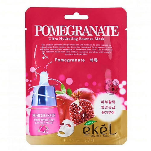 Ekel Ultra Hydrating Essence Mask Pomegranate – это тканевая маска для эластичности кожи с гранатом содержит большое количество витаминов и минералов, которые питают кожу, придают ей сияние и оказывают мощное антивозрастное действие. Экстракт граната, богатый фитоэстрогенами, витамином С, кальцием, железом стимулирует синтез коллагена, улучшает микроциркуляцию, обладает выраженным антиоксидантным действием, увлажняет, смягчает и выравнивает кожу, предотвращая преждевременное старение. Гранат защищает кожу от негативного воздействия солнечных лучей и преображает сухую, уставшую и обезвоженную кожу. Применение маски с экстрактом граната значительно улучшит состояние кожи, уменьшит морщины, придаст сияние и освежит тусклую и уставшую кожу. Этот экстракт очень эффективен для чувствительной и сухой кожи, так как обладает способностью восстанавливать гидролипидный барьер.