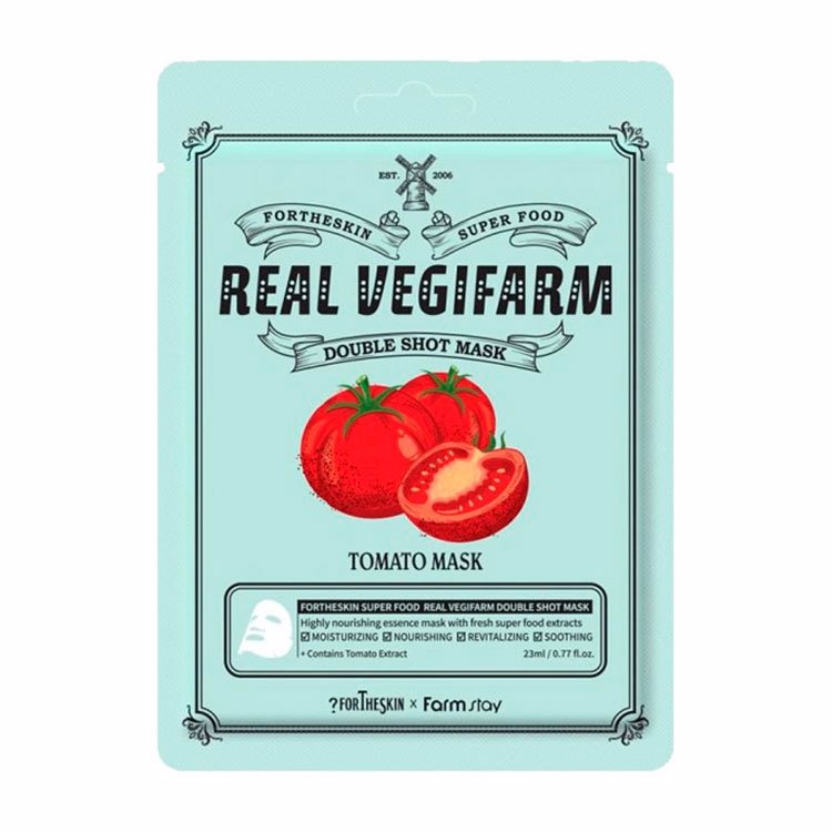 Fortheskin Super Food Real Vegifarm Double Shot Mask Tomato – Маска эффективно снимает усталость и придает коже естественное сияние и блеск. Экстракт томата содержит такие полезные элементы, как ликопин, витамин В, С в обилие. Они проникают глубоко в кожу и провоцируют процессы обновления кожи, а также повышают эластичность и придают сияние и блеск.