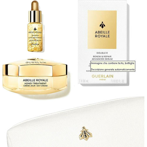 Состав набора: Дневной крем – Guerlain Abeille Royale Honey Treatment Day Cream, 50 мл + Масло для лица – Guerlain Abeille Royale Advanced Youth Watery Oil, 5 мл + Сыворотка – Guerlain Abeille Royale Double R Renew & Repair Advanced Serum, 7×0.6 мл + Сумка.