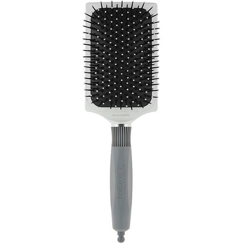 Щетка не только деликатно расчесывает пряди, но и массажирует кожу головы. Это существенно улучшает микроциркуляцию, а значит, способствует росту здоровых и красивых волос. Аксессуар имеет керамико-ионное покрытие и нейлоновые детали. Ручка щетки выполнена из прорезиненного материала. Благодаря ее многогранной форме, щетку очень удобно держать во время расчесывания. Оснащена ручка разделителем прядей. Расческа препятствует статическому эффекту и делает волосы более блестящими.