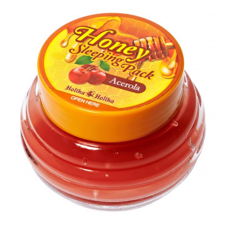 HOLIKA HOLIKA HONEY SLEEPING PACK ACEROLA (90ml) – глубоко очищает кожу лица, делает ее нежно и гладкой. Маска эффективно увлажняет кожу, смягчает ее и придает эластичность, снимает признаки усталости и старения, придает свежий цвет лица. Содержит 20% натурального меда и 20% экстракта ацеролы (барбадосской вишни). Экстракт ацеролы содержит большое количество витамина C и придает коже жизненную силу, повышает упругость, а мед глубоко увлажняет, смягчает, устраняет мелкие морщины и омолаживает. Подходит для всех типов кожи.