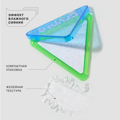 Желейная текстура хайлайтера наполнена светящимися алмазными частицами светло-розового цвета, создающими максимально сияющий и влажный финиш. Создание продукта вдохновлено криптоартом чилийского художника Matнas Vivanco Brellenthin, более известного как Brellias. Его произведения — это сочетание сюрреализма и научной фантастики. Как настоящий криптограф, благодаря этому хайлайтеру можно взломать систему шифрования самых красивых мейков.