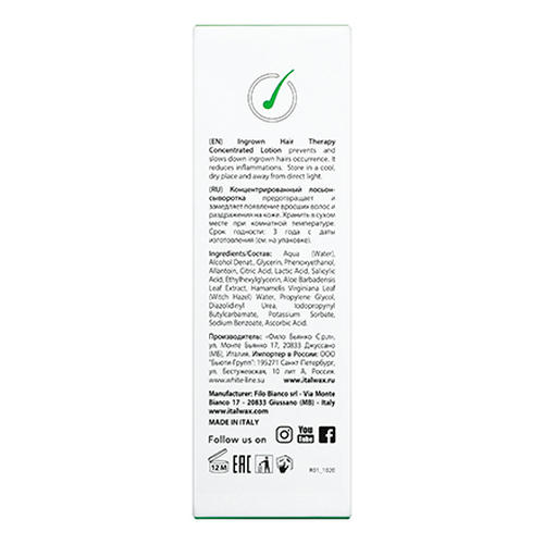 Жидкий концентрированный лосьон создан специально для предотвращения врастания волос после депиляции на больших поверхностях (руки, ноги), а также для устранения последствий вросших волос. Лосьон-сыворотка быстро впитывается и активно размягчает верхний слой кожи. Лосьон-сыворотка оказывает активное смягчающее, противовоспалительное и заживляющее действие. Значительно уменьшает покраснение и отек.Рекомендуется: для профилактики и устранения вросших волос. Зоны нанесения: руки, ноги.Активные компоненты: салициловая кислота, миндальная кислота, лимонная кислота, экстракт алоэ вера, экстракт ромашки, экстракт гамамелиса.