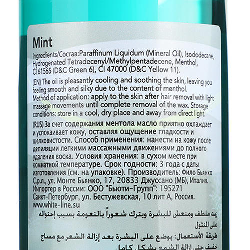 Масло легко и быстро удаляет липкость и остатки воска с кожи, смягчает и охлаждает кожу после депиляции, оставляя ощущение гладкости и свежести. Активный компонент: ментол, входящий с состав масла, охлаждает и успокаивает кожу, снижает болезненные реакции, уменьшает воспалительные процессы, понижая местную температуру. Обладает антисептическими свойствами, увеличивает микроциркуляцию в коже. Рекомендуется для использования после депиляции тёплыми восками. Зоны нанесения: руки, ноги.